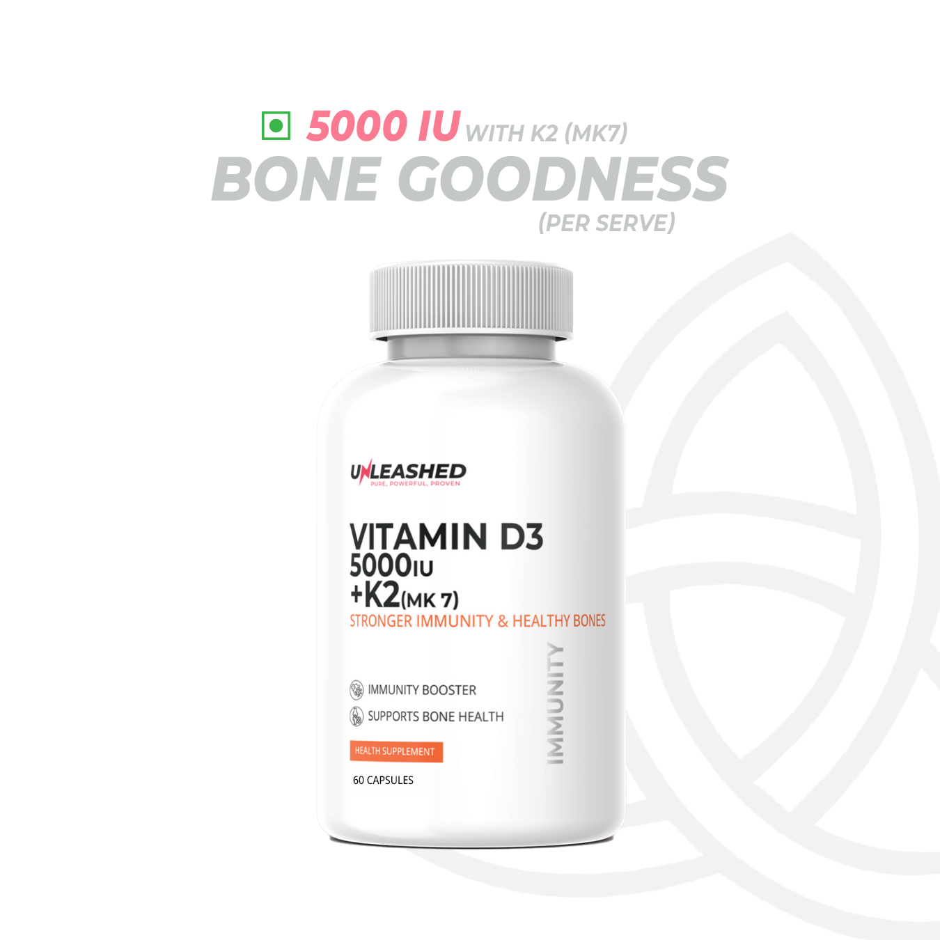 Unleashed Vitamin D3 5000IU + K2 55mcg (MK7) | Strong Bones, Immunity & Heart Health - 60 Veg Capsules